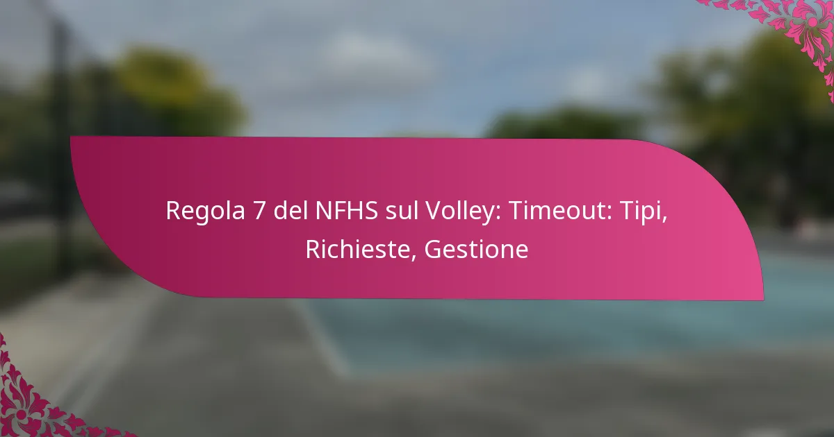 La Regola 7 della NFHS fornisce linee guida complete per la gestione dei timeout nel volley, inclusi i loro tipi e le responsabilità di giocatori e ufficiali. I timeout sono essenziali per le squadre per riorganizzarsi, pianificare strategie e affrontare la fatica dei giocatori. Ci sono tre principali tipi di timeout: timeout di squadra, timeout ufficiale e timeout per infortunio, ognuno con regole specifiche che influenzano la dinamica del gioco. Familiarizzare con le procedure per richiedere e gestire questi timeout è fondamentale per un gioco efficace.